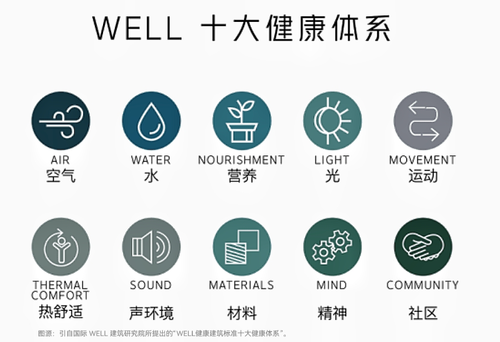 师生的身心健康是每所学校首要关注的重点。WELL健康建筑认证是由国际WELL建筑研究院(IWBI)推出的国际认证体系,秉承“建筑以人为本”的理念,关注建筑空间对使用者健康和福祉的影响,重点关注空气、水、营养、光照、健身、舒适度、声音、材料、精神和社区等十个方面。认证范围囊括写字楼、学校、酒店、住宅、零售等建筑类型,在全球40多个国家推广,被认为是健康建筑领域的权威标准。